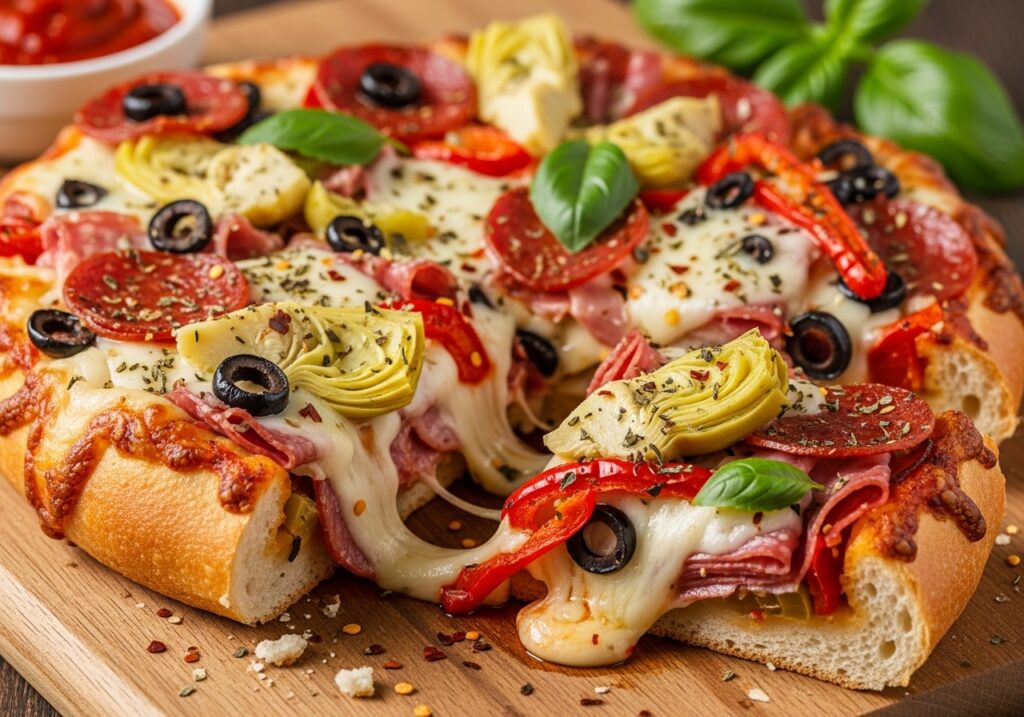 Baked Antipasto Cheese Bread is a warm, gooey, and flavorful appetizer that combines melted cheese, savory meats, and marinated vegetables on a crispy loaf of bread. It’s like your favorite antipasto platter baked into one irresistible cheesy loaf — perfect for parties, holidays, or an easy dinner side.