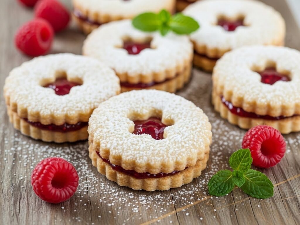 Spread about 1 teaspoon of jam on the bottom side of a full cookie. Place a cut-out cookie on top and press gently. Dust with powdered sugar before serving.